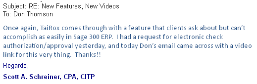 "Once again, TaiRox comes through with a feature that clients ask about but can't accomplish as easily in Sage 300 ..." Scott Schreiner, AXIS Integrated Solutions. Show complete quote.
