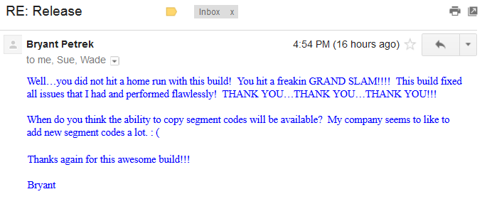 Ship Orders Enhancements: "RE: Ship Orders ... thank you very much for the impressive turnaround for this relatively flag ship client of ours." Mel Marulanda, D&A Business Management Solutions. Show complete quote.